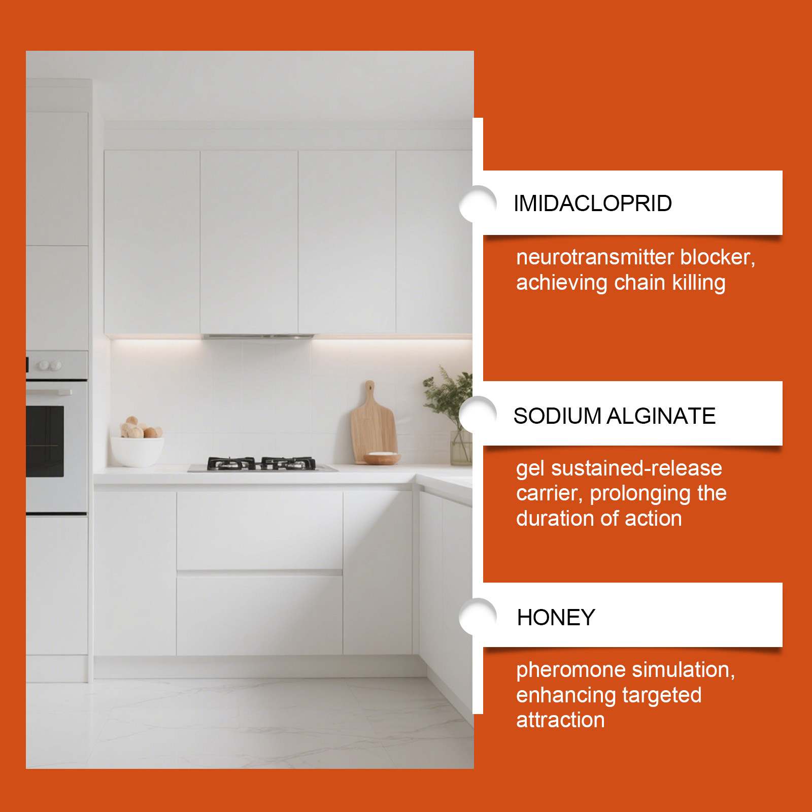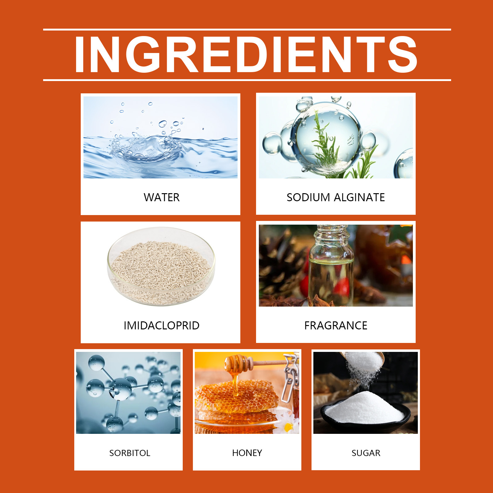 Ingredients: Water, sorbitol, sodium alginate, imidacloprid, honey, white granulated sugar, (daily-use) essence