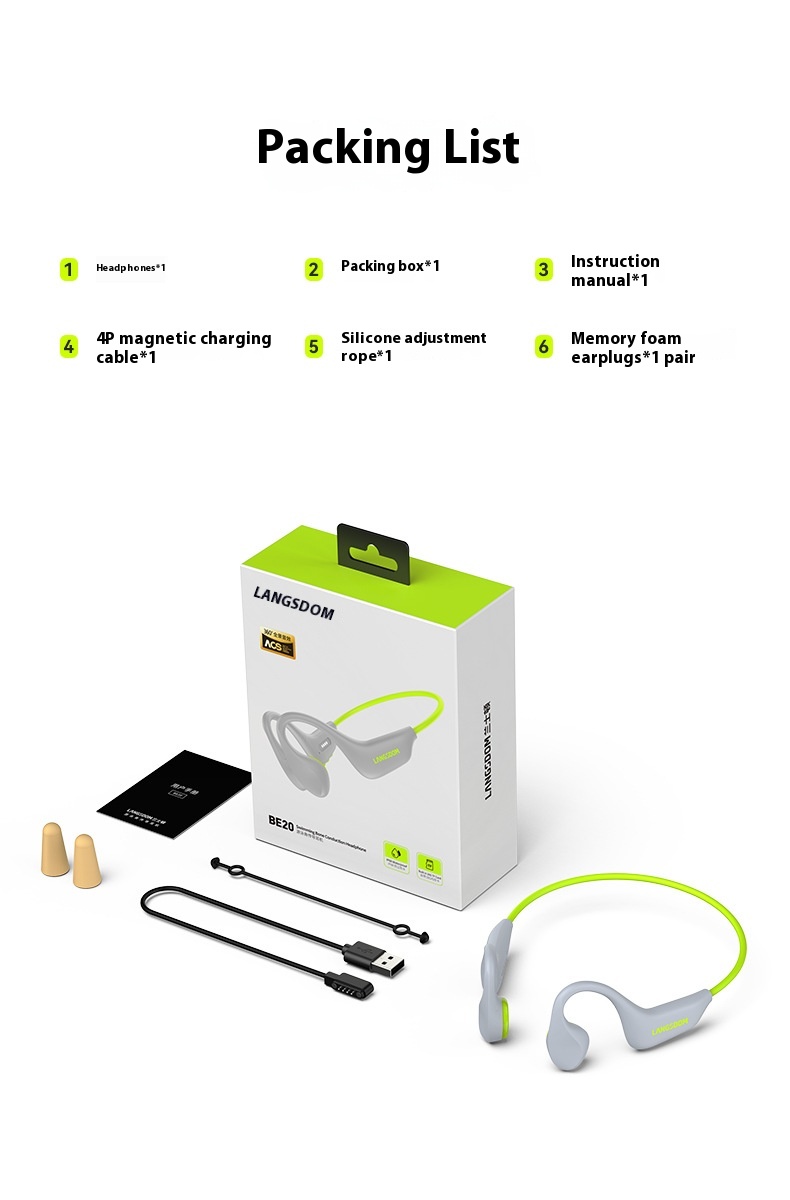 Headphones *1 Packaging box *1 4P magnetic charging cable *1 Silicone rubber adjustment rope *1 Instruction Manual *1 Memory foam earplugs *1 Set